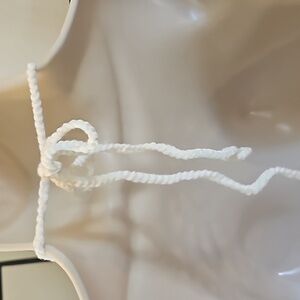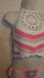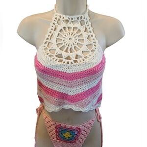 Hand crafted crochet crop top. Floral granny square design in pink and white. Two-color combination, 100% cotton yarn. Features a trapezoid shaped open stitch hollow out floral pattern. Ties at neck and back with multiple styling options (criss-cross, halter, double around neck). See-through, suitable as a bathing suit cover-up. Cropped length: 14 inches. Bikini bralette style. Measurements: Wide stretch - 20 inches, Neck ties - 22 inches, Length - 14 inches, Granny square - 7x7 inches. Hand knit crochet. One-of-a-kind wearable art. Multicolored with elastic on back.