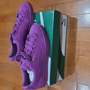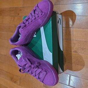 Violet suede sneakers from Puma. Size 6 Suede with big fat laces and a gummy sole. Ideal for a bold fashion statement.