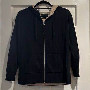 Banana Republic, Stylish black zip-up hoodie with a beige lining. Features a front zipper and hood.
