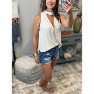 Trendy choker sleeveless top. Floaty fit with front cutout and keyhole back. Two button closure back of neck. Double layer front.