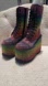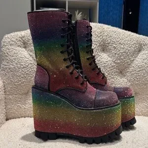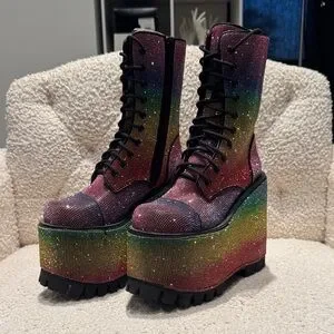 Elevate your look with these stunning multicolor glitter platform boots. Perfect for making a bold fashion statement.