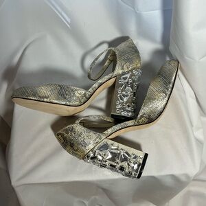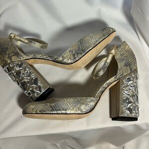 Elegant gold heels with ankle strap. Intricate heel design. Perfect for special occasions.