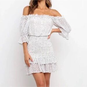 A gently used (worn once) off-the-shoulder white polka dot dress that’s perfect for a day-to-night ‘fit.