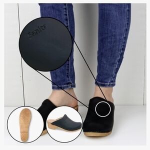 Experience comfort with Sanita's stylish black mules. Durable tan sole for everyday wear.Roomy for your toes