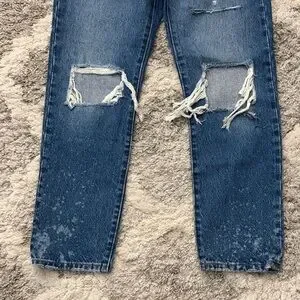 Classic Levi’s 501 Original Fit jeans in a medium blue wash with trendy distressed knees. These jeans feature the iconic straight-leg silhouette and button-fly closure — a timeless wardrobe staple with a modern, edgy twist.