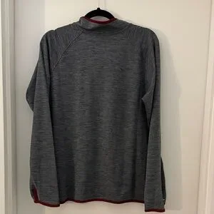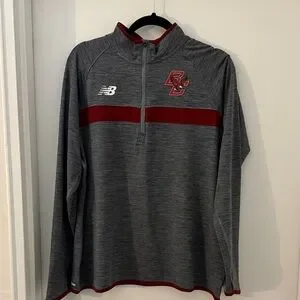 Stylish gray and red quarter-zip pullover by New Balance. Features a Boston College logo design.