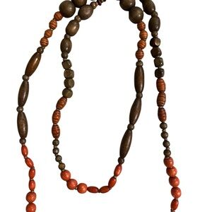 This vintage necklace features brown and orange wooden beads in various shapes. The double strand design closes with a double lobster claw clasp.