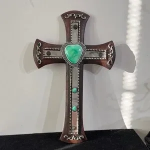 Enhance your home decor with this elegant wall cross. Featuring a rich brown finish with silver detailing, it is adorned with striking turquoise accents. Perfect for adding a touch of sophistication to any room.