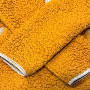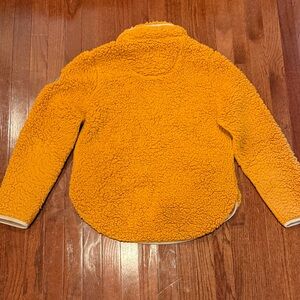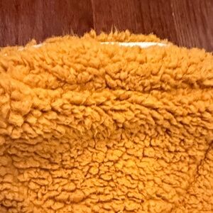 Cozy orange sherpa jacket by Simply Southern. Features a half-zip design and front pockets. Perfect for chilly days. Small stain on left pocket shown but can hardly see it. Arms show flattened areas of Sherpa but still very fuzzy and warm. Washes well, hang to dry.
