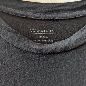 Amazing All Saints Rip It Up tunic tee. Semi sleeveless, wide crew neck, oversized and sooo comfy. Flattering high low hem. Black with a very cool gray tone graphic over half the shirt. Has some slight wear at underarm sleeves, but nothing crazy. Minor wash wear overall. Very slightly wrinkled from laying flat to air dry. Please see photos for the details.