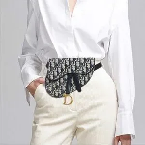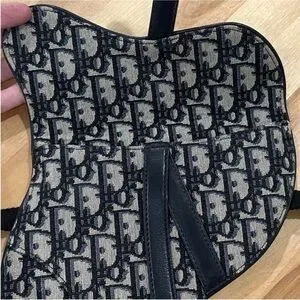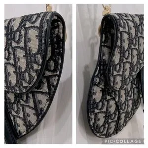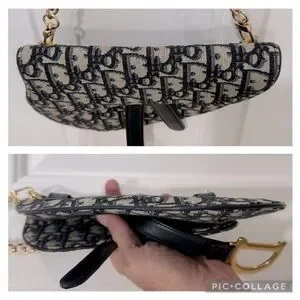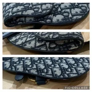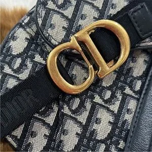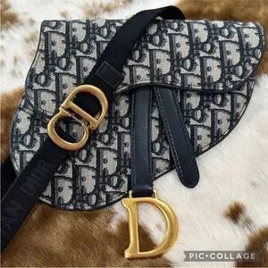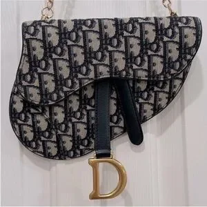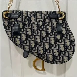 This specific model was from Dior's Spring/Summer collection. It features the iconic saddlebag shape and the prominent Dior Oblique monogram canvas in navy on a grayish beige. It has D rings on the back as well to add a strap of your choosing. For pics I added a 16" gold chain just to display & show an additional optional look. The bag has a flap top with a magnetic closure, 1 main compartment & back slip pocket. It came with a black detachable Christian Dior webbing waist strap with Brushed Gold Tone CD Buckle. This has been authenticated already & will go through Poshmark authentication again after purchase