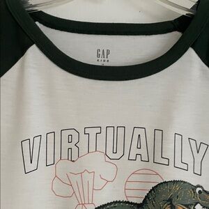 GAP Kids long sleeve tee with dinosaur graphic. 'Virtually Jurassic' text. Stylish and comfy in green and white.