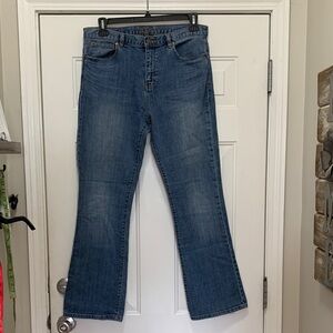 Classic straight leg jeans. Comfortable fit. Timeless style. 99% cotton. Waist is 17.5 inches, rise 12 inches, inseam 30 inches.