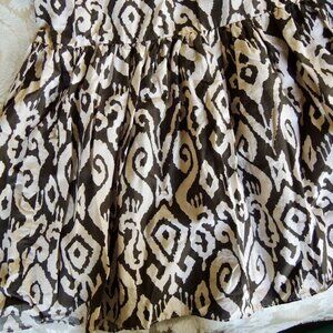 Zara brown & white tribal print strapless dress, size Medium. Classic smocked cotton sundress is white (on the cream end) with brown tribal style print. Bodice is stretchy smocking, gathered to a billowy A-line skirt with a deep ruffle hem. Midi length. Airy and comfortable, with a beachy vibe. Can also be worn as a maxi skirt. EUC.
