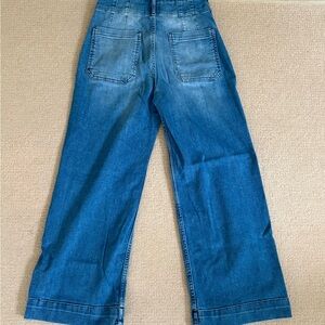 Stylish Colette-style cropped wide leg jeans. Classic blue denim. Universally flattering. Front pockets. Button closure.