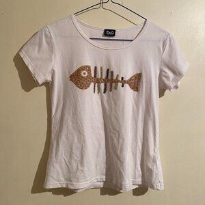 Amazing D&G Y2K fitted long sleeve embellished tshirt with elaborate beaded and sequin fishbone design. Back glittery fish graphic.