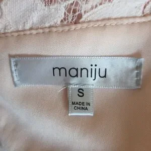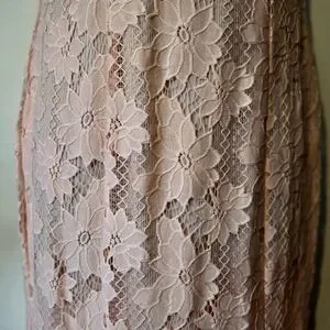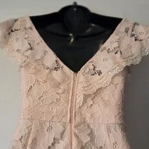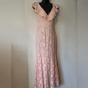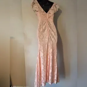 Absolutely gorgeous pink lace floral gown by Maniju. Fully lined with back zipper. Mermaid stye. Stunning v-neck with ruffle collar that extends to the back. Feminine and chic. Colour is close to stock shot. PTP 17" with stretch to 19". No pulls or tears. EUC. Ideal dress for a prom, wedding or special occasion. No fabric tags but appears to be stretchy polyester.