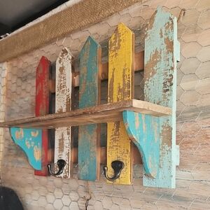 Enhance your home with this rustic multicolor wooden wall decor. Featuring vibrant red, blue, yellow, and brown tones, this piece adds a charming touch to any space. Perfect for organizing with its practical hooks.