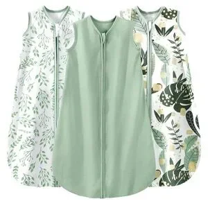 Set of three baby sleep sacks in green and white. Features leaf and floral patterns. Perfect for cozy nights. Yoofoss Baby Sleep Sack 6-12 Months Wearable Blanket for Babies 100% Organic Cotton 2-Way Zipper Toddler Sleeping Sack 3 Pack, Soft Lightweight Sleep Sacks