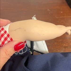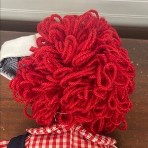 Charming rag doll featuring vibrant red hair and a classic blue outfit. Perfect for imaginative play and cuddling. A delightful addition to any child's toy collection. He is missing a finger, and has some marks on his face an arm.