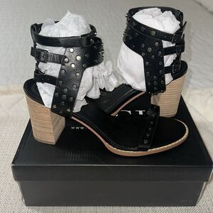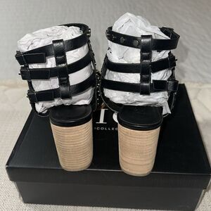VICI 10 Celeste Black Metallic Studded Block Heel Strappy Multi Buckle Sandal