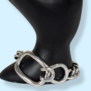 This vintage bracelet is made of a silver tone metal and has a hook closure. The bracelet is made with a sturdy chain, and the clasp is curved with a cut-out center. I believe the bracelet is supposed to be worn as seen in pic 1, with the hook on the inside facing out. There is normal wear, including superficial marks in the metal, but the piece is very wearable and very cool.