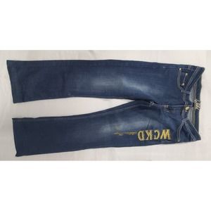 These are women's size 9 Wckd jeans in a straight cut style made of denim with gold embroidered accents. The jeans feature a 5-pocket design, a mid-rise fit, and a comfortable stretch fabric blend of polyester, spandex, and cotton. They are in a medium wash blue color with a 32-inch inseam. The design is inspired by Y2k fashion trends, offering a retro hipster look that is suitable for various seasons and themes.