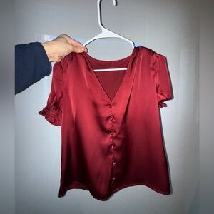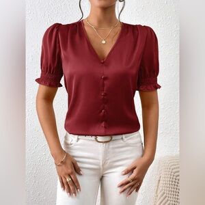 Elegant Burgundy V-Neck Blouse satin frill button front puff sleeve office night