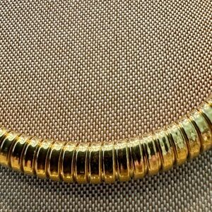 Elegant gold-tone bronze statement necklace featuring a bold design. Perfect for adding a touch of luxury to any outfit.