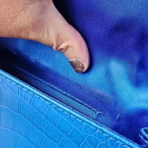 Croc embossed outer vegan faux leather. Clips for adding a strap. There is no strap. Magnetic closure.