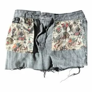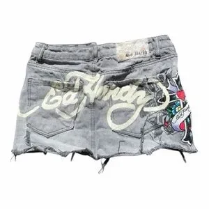 Trendy gray jean mini skirt by Ed Hardy. Features bold graphic design. Ideal for casual wear.