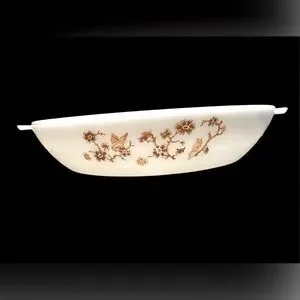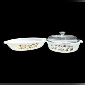 3 piece set of vintage Termo Rey milk glass casserole dishes. Coquette pattern. Round dish includes lid. Oval dish has no lid. All dishes are in excellent, clean condition with no chips or cracks.