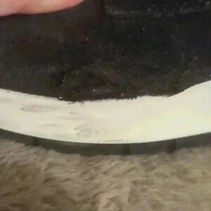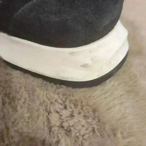 There are some marks and a partial tear on the front side of the shoe as shown in the picture. Otherwise the item is in good condition.