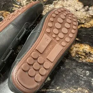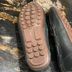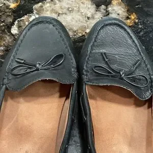 Pre loved and gently worn. Very clean. Superficial wear at heels and toes as pictured. White scuff on sole of left shoe but not visible when wearing. Right shoe upper is slightly textured in comparison with left shoe as pictured. Purchased like this. Elegant black leather loafers with bow detail. Comfortable and stylish for everyday wear.