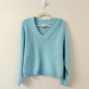 CABI Blue Knit V-neck Sweater Womens S Oversized Casual Colorful Winter Blue