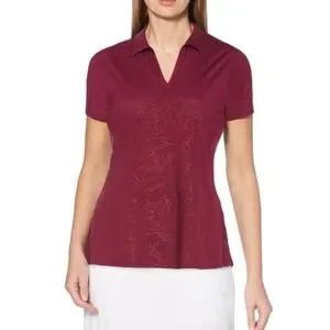 Look and feel great in this ladies golf top while out on the course. A subtle embossed floral design elevates the style of this Callaway golf shirt. Opti Dri™ moisture wicking technology built into our womens golf shirts pulls sweat away from the body for on-course comfort throughout your round. This comfortable womens golf polo is crafted from lightweight, stretch fabric that allows you to maximize your range of motion. Drive the ball down the fairway or putt for par without restriction.