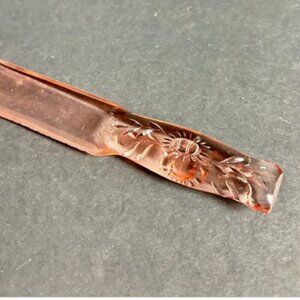 Beautiful vintage pink Depression glass cake knife featuring elegant etched floral design on the handle. This lovely serving piece showcases the warm peachy-pink color so beloved in Depression era glassware.