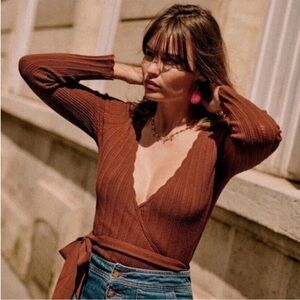 SEZANE Brown Ecovero Lenzing Scallop Stretch Knit Solweig Wrap Cardigan Sweater
