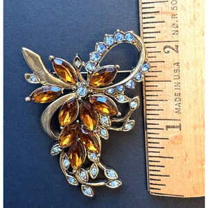 Vintage KC Floral Flower Nature Gold Tone Amber & Blue Rhinestones Brooch 2"