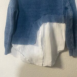 Stylish Vintage Wash navy blue sweater with a unique white asymmetrical layered hem. Perfect blend of comfort and fashion. Chunky , ribbed knit . 100%cotton , round neck , half button down, relaxed fit. Gently used . Good condition