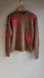 Stay cozy and stylish with this tan camel chunky sweater featuring pink floral embellishments. Perfect for adding a pop of color to your wardrobe.