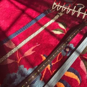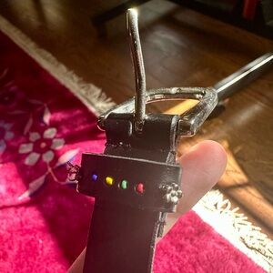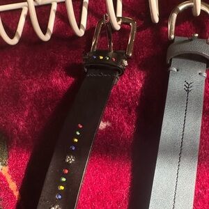 Black leather belt embellished with colorful beads! Gently used, slight creasing in the leather, particularly at the end. Super cute with jeans.