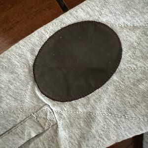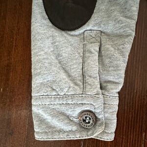 Stylish gray hooded jacket with plaid lining and elbow patches. Perfect for a chic look. Sweatshirt material with quilted stitching.
