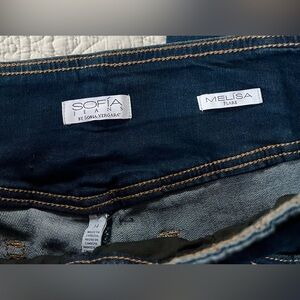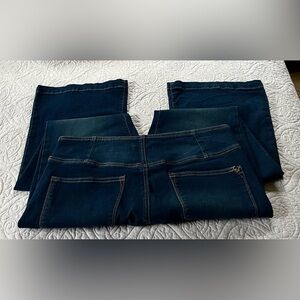 Beautiful new without tags and never worn, Sophia Vergara Melisa flare pull-on high rise jeans in dark wash blue size 14. Feature classic 5 pocket design. Measure approximately 17” width x 32.50” leg inseam x 11” width at bottom leg flare. Fabric content is 59% cotton, 28% polyester, 12% viscose, and 1% spandex. Machine washable on cold cycle. Classy flattering jeans in new condition.