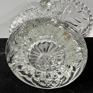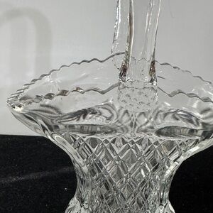 Beautiful clear glass basket with intricate design. Perfect for home decor or gifting. Vintage item normal wear did not see no chips no cracks.
