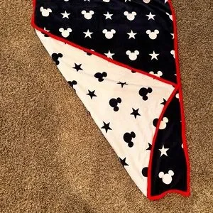 Cozy blanket featuring Mickey Mouse and star pattern. Black and white design with a vibrant red trim.