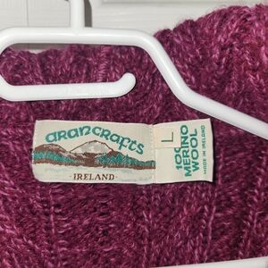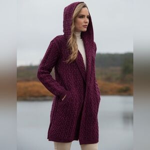 🌼 Aran Crafts Ireland open front cardigan. Hooded, pockets, long sleeved, 100% merino wool. Irish shawl collar hooded cardigan, 100% Merino Wool, traditional herringbone design stitches are a unique style feature. made in Ireland. The cardigan has side slits and insert pockets for extra comfort. Super cozy and soft, Irish sweater, rich burgundy.
