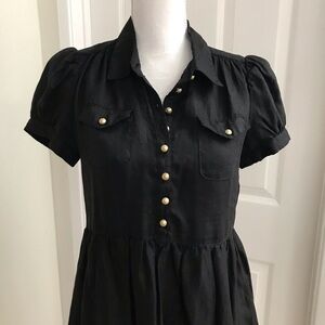 French Connection Black Linen Gold Button Front Dress w “puff” sleeves, side pockets and a ruffled hem