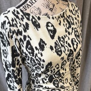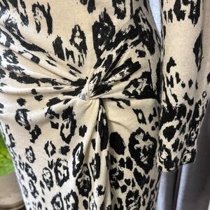 Embrace your wild side with this chic leopard print dress. Featuring a stylish black and white design, it's perfect for the cooler seasons. The long sleeves add a touch of elegance. Either a forgiving fabric that stretches well. Fully lined. Pencil style; note, that the dress does not have a kick pleat.