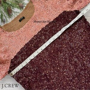 J.Crew RARE NWT vintage long sleeve crewneck fine stretch wool sweater dress adorned in swirled stitched burgundy and blush pink sequins is perfect this upcoming season with boots or heels. No fabric or size tag but measurements equate to a size small. Straight cut silhouette, molds to curves. Fabric does have stretch for added fit & comfort. See photos for UN-stretched measurements.